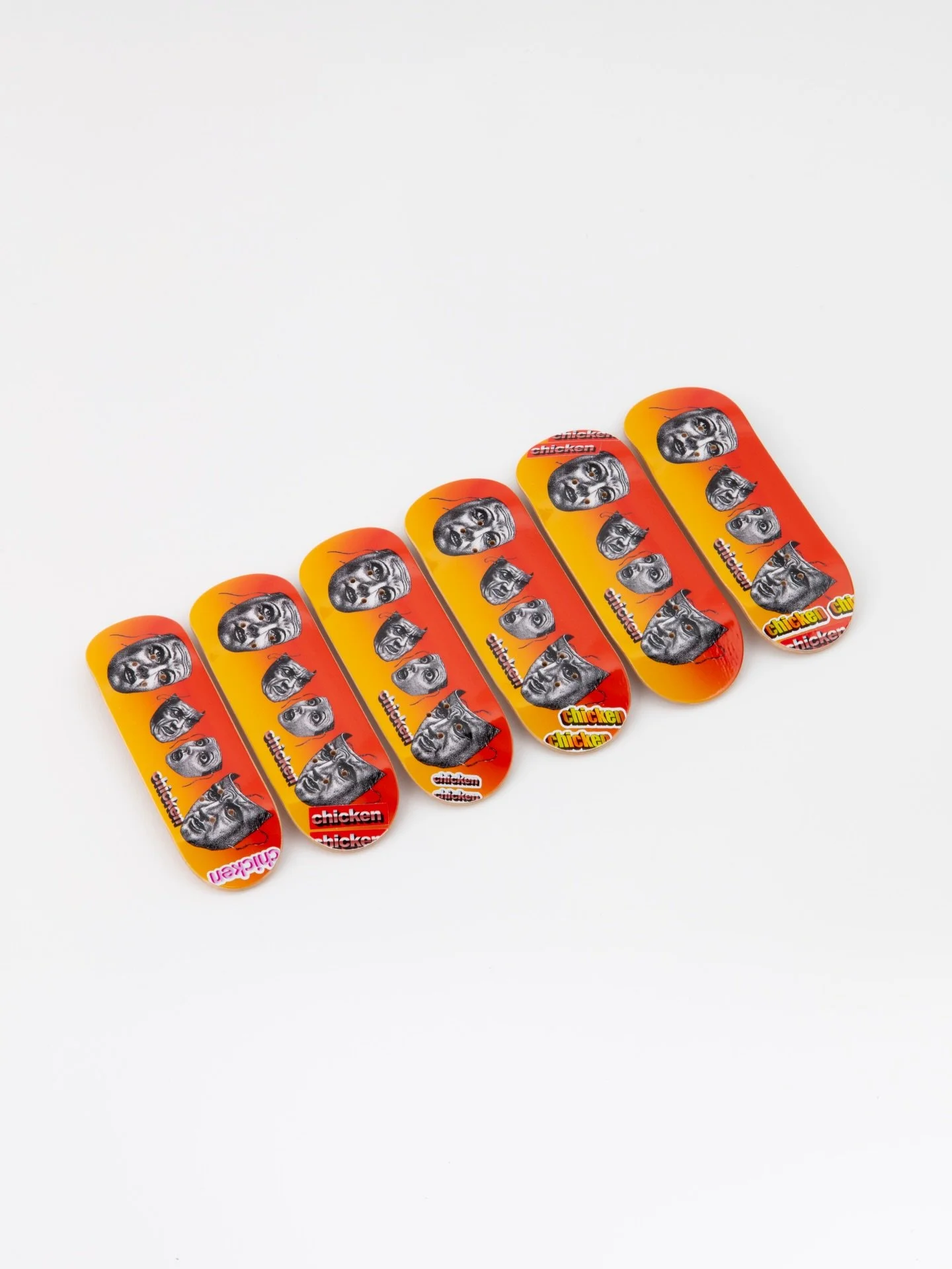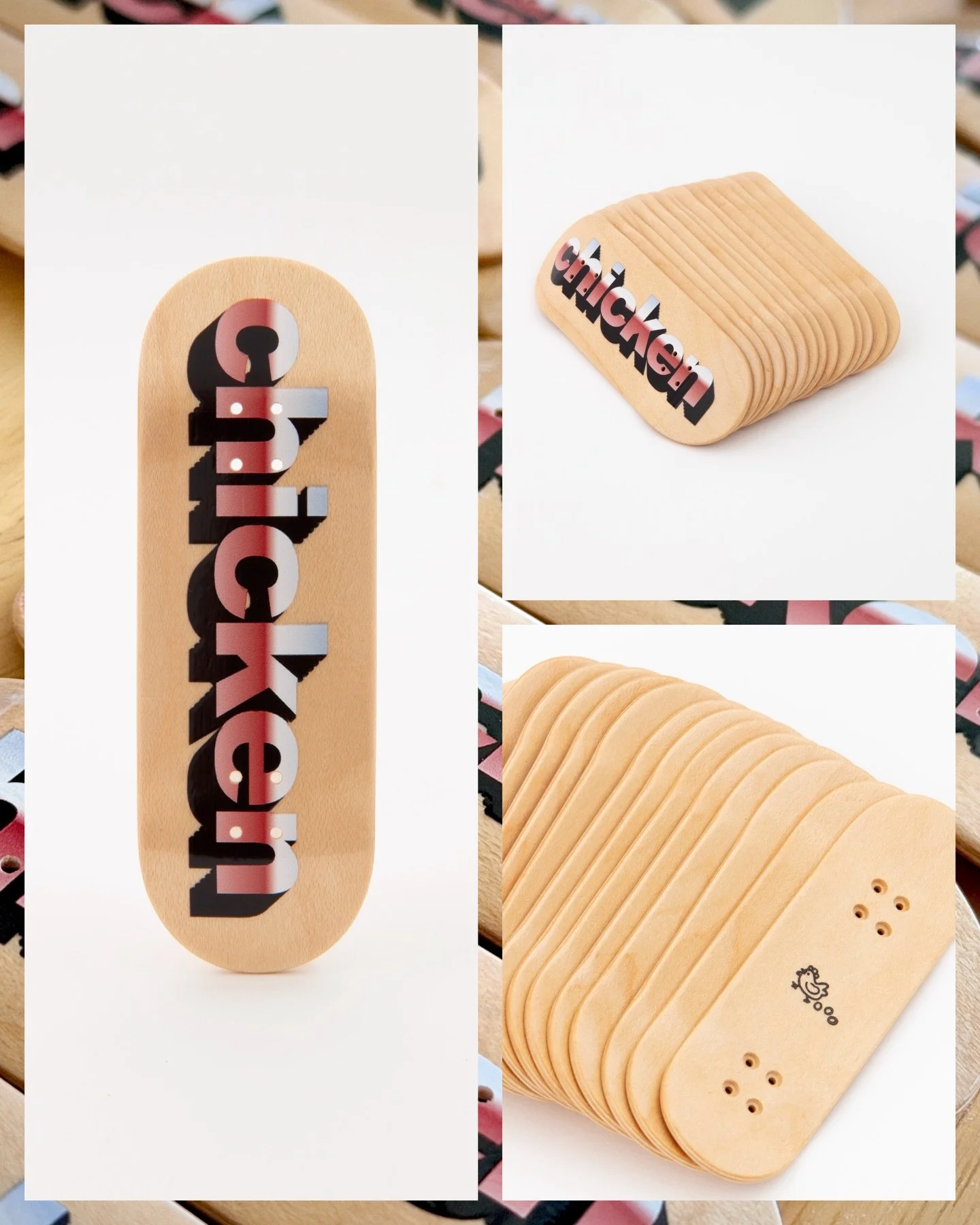These decks have very minor cosmetic blemishes relating to heat transfer graphic application. It’s purely visual and doesn’t affect the performance of the deck at all. In fact, it’s actually not even visable anymore because we tastefully covered any imperfections with some sick ass stickers. Here’s your chance to try some Chicken wood for half off, don’t sleep.